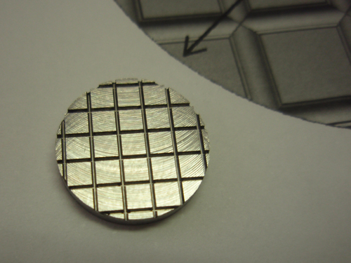 前回紹介しました点滴加工も利用して細溝加工(溝巾0.5、深さ0.5)という加工を行いました。ある研究機関からのテストピースですが、純チタンの加工です。こんな加工でも工具の刃先が持つというのは、やはり点滴加工の威力でしょうか?